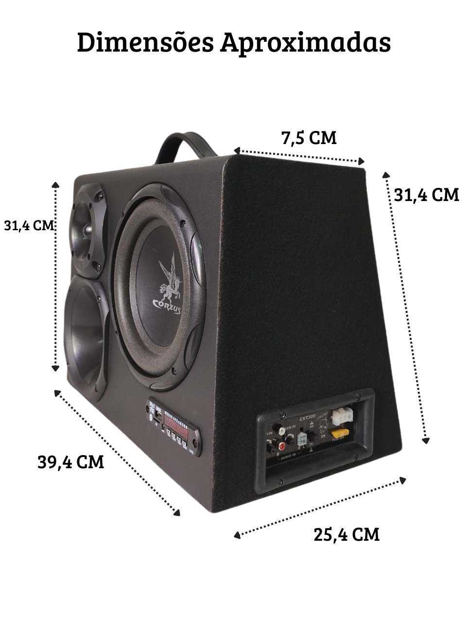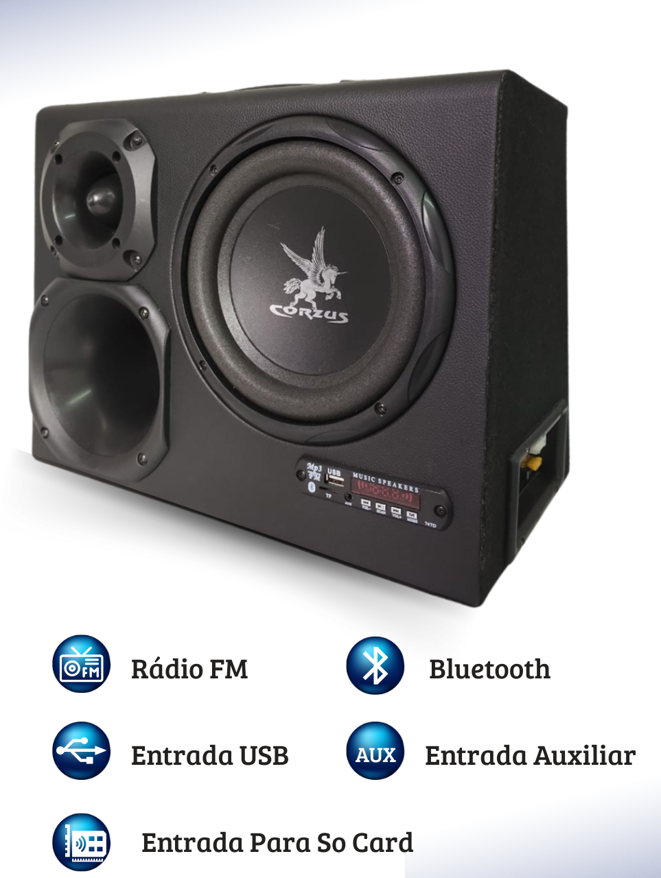 A CORZUS CXHC 500 8″ é uma caixa amplificada com conceito inovador de dupla função. Podendo ser utilizada em casa como caixa de som portátil 110/220V ou em carros como caixa de subgrave e caixa trio em 12V, entrada de áudio via RCA (alta impedância) e via fio (baixa impedância), sistema de reprodução de áudio integrado com Bluetooth, USB (pen drive), SD card e auxiliar P2.