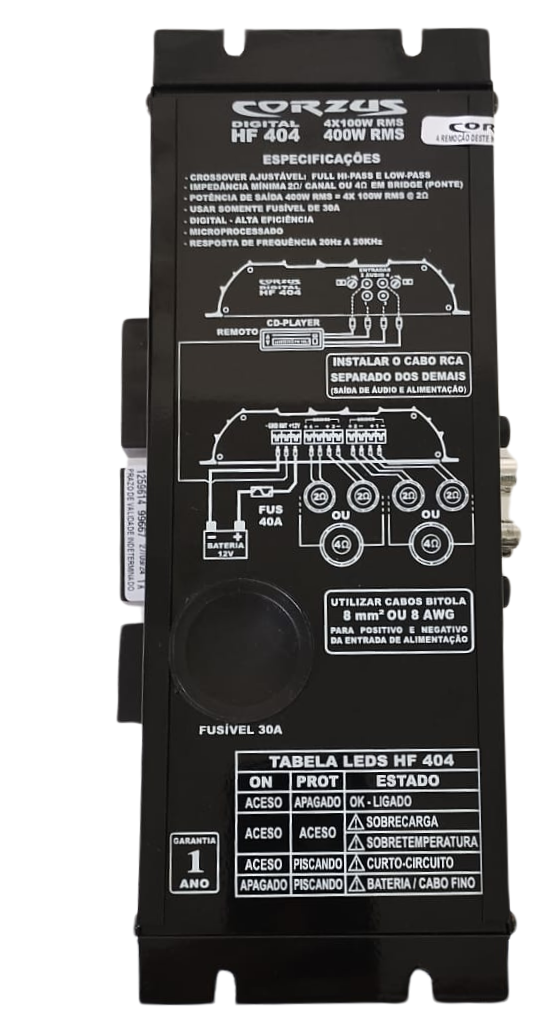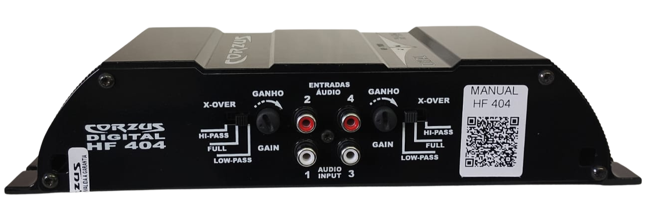 Entradas de áudio RCA e crossover HI/PASS/LOW. A Linha HF tem eficiência e qualidade em todos os níveis de frequência, sejam graves, médios ou agudos. Pode ser utilizado em 4,3 e 2 canais.
