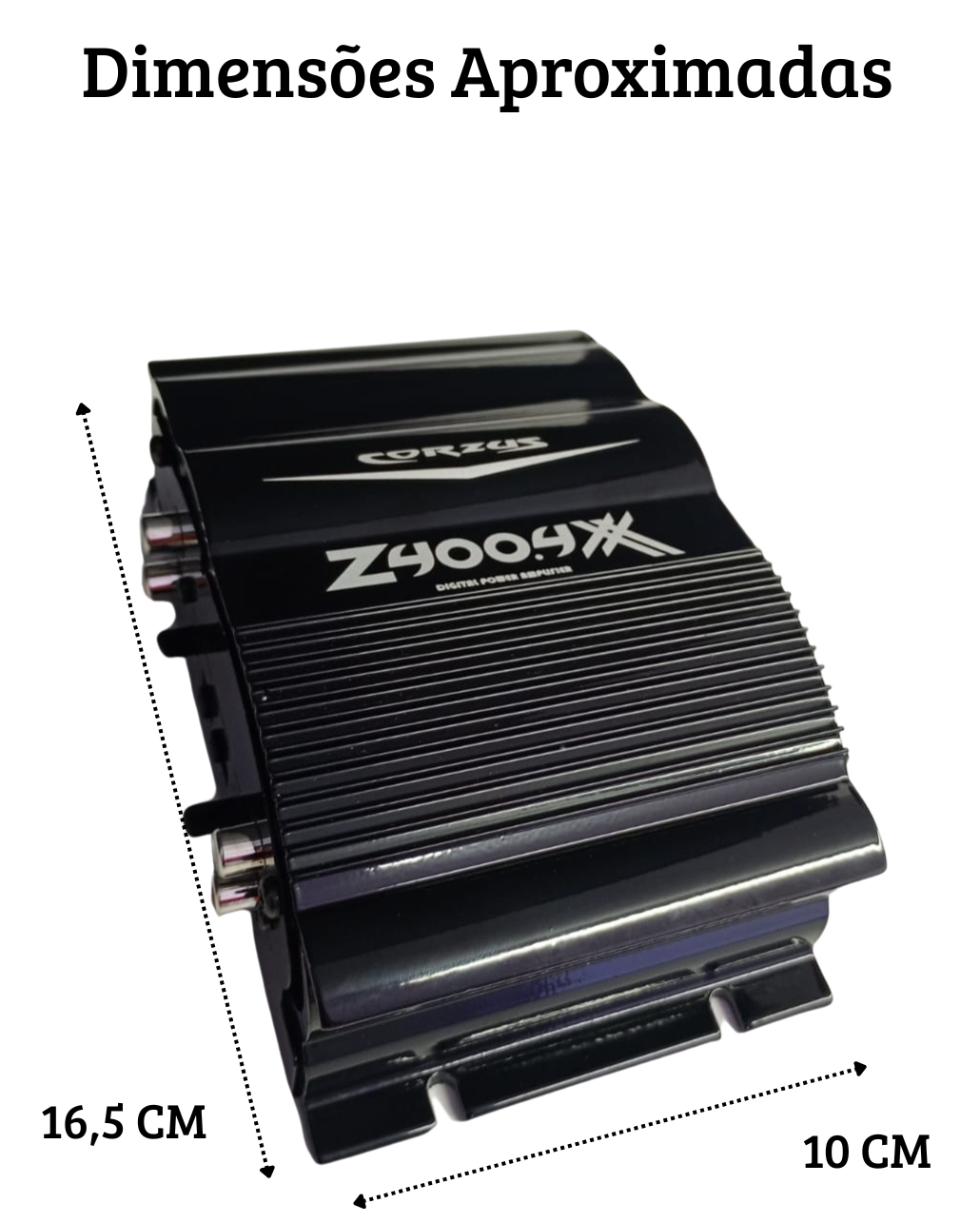 O CORZUS Z 400.4X é um amplificador digital, desenvolvido para os mais variados tipos de sistemas de som automotivo. É multicanal, sendo 4 canais de 100 Watts, com potência máxima de 400 Watts e impedância de 2 ohms, crossover Hi | Pass | Low.